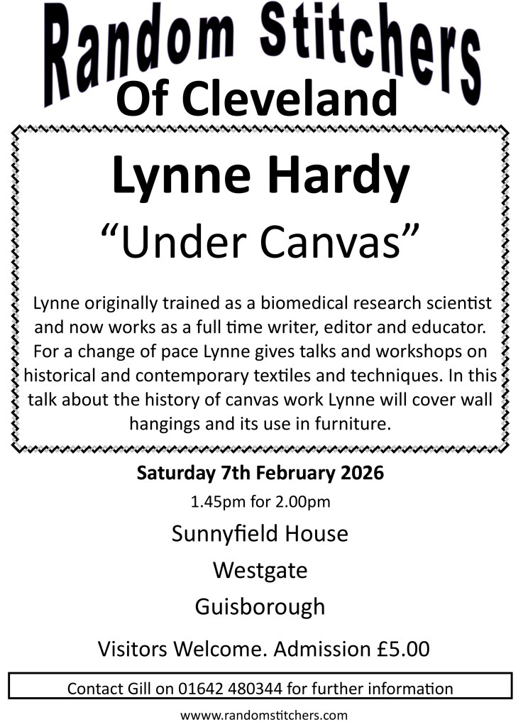 Random Stitchers of Cleveland meets on the first Saturday of each month, except August, at 1.30pm. The meetings are held at Sunnyfield House, Westgate, Guisborough.